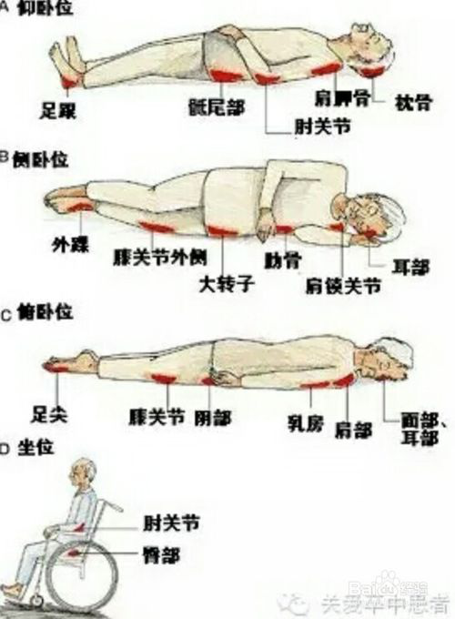 3. 勤檢查 每次擦洗.翻身時(shí)要檢查皮膚情況,尤其是容易發(fā)生壓瘡的受壓部位(如下圖),如肩胛部,骶尾部,足跟處等,每天至少檢查一次,查看皮膚時(shí)對(duì)受壓部位要勤按摩,可用大魚(yú)際環(huán)形輕輕按摩,以增加血液循環(huán),一旦發(fā)現(xiàn)皮膚發(fā)紅發(fā)紫水泡破潰等,一有異常必須高度重視。