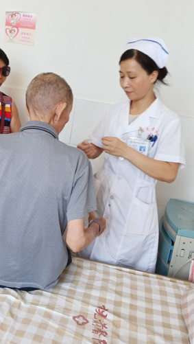 講座中,受邀的病友潘某氣喘不適,林美芳護(hù)士長(zhǎng)立即攙扶他返回病房休息,按醫(yī)囑為其接好氧氣做好病情觀察。