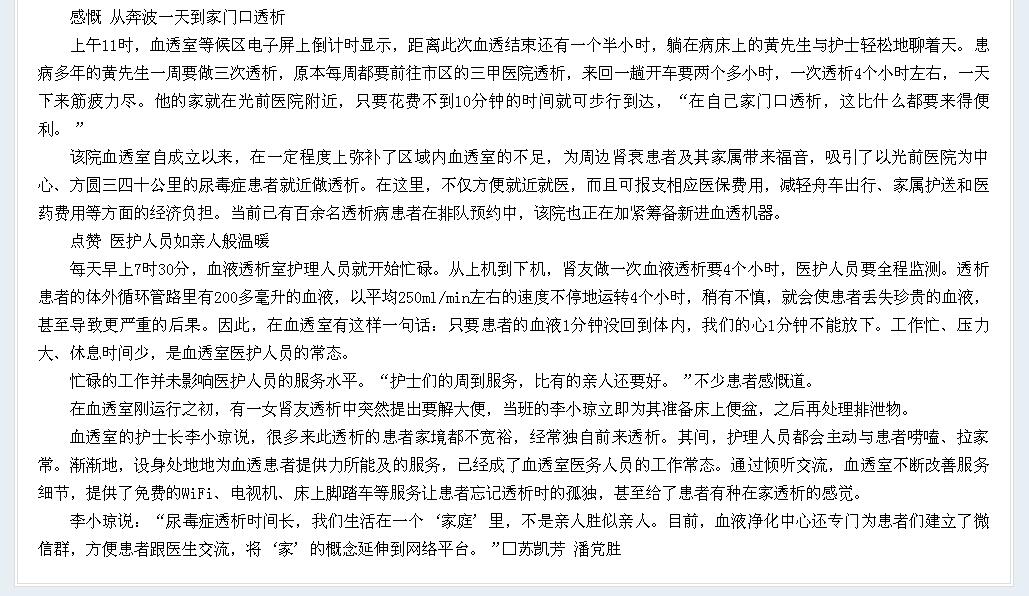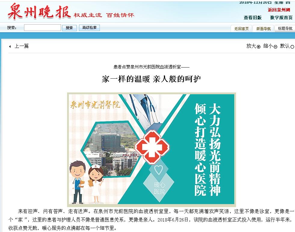 患者點贊泉州市光前醫(yī)院血液透析室——