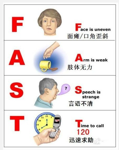 “FAST”是國際上快速識(shí)別中風(fēng)的方法,簡便實(shí)用。FAST就是4個(gè)英語單詞的開頭字母。