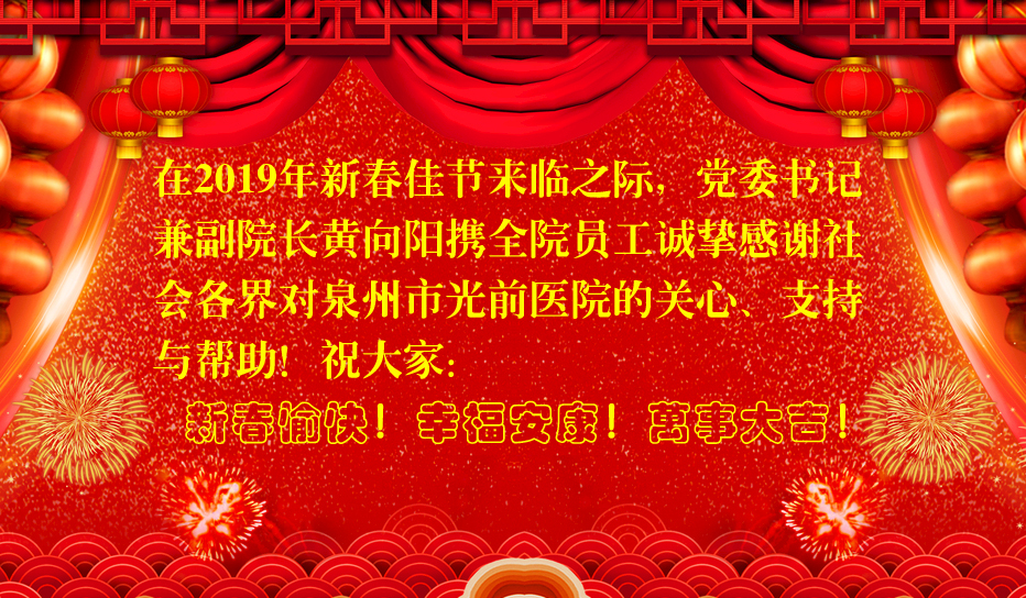 在2019年新春佳節(jié)來臨之際,黨委書記兼副院長(zhǎng)黃向陽(yáng)攜全院?jiǎn)T工誠(chéng)摯感謝社會(huì)各界對(duì)泉州市光前醫(yī)院的關(guān)心、支持與幫助!祝大家: