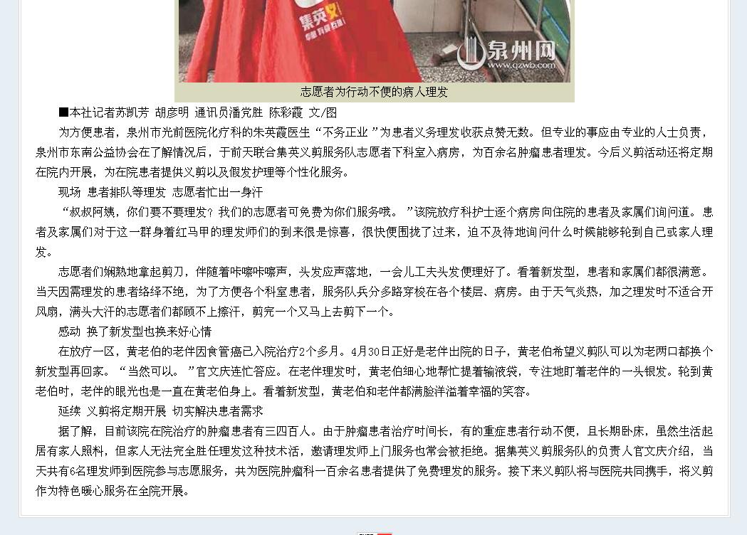 為了方便患者,泉州市光前醫(yī)院化療科的朱英霞醫(yī)生“不務(wù)正業(yè)”,義務(wù)幫助患者理發(fā),這一舉動(dòng)收獲眾多市民的點(diǎn)贊(詳細(xì)報(bào)道請(qǐng)點(diǎn)擊??:病人被醫(yī)生剃光頭,卻大贊暖心!)。專業(yè)的事由專業(yè)的人來做,泉州市東南公益協(xié)會(huì)了解情況后,聯(lián)合集英義剪服務(wù)隊(duì)的志愿者,為百余名腫瘤患者理發(fā)。據(jù)悉,義剪活動(dòng)將作為該院開展暖心服務(wù)的舉措之一,定期開展,為在院患者提供義剪以及假發(fā)護(hù)理等個(gè)性化服務(wù)。□泉州晚報(bào)記者 蘇凱芳 胡彥明 通訊員 潘黨勝 陳彩霞 文/圖