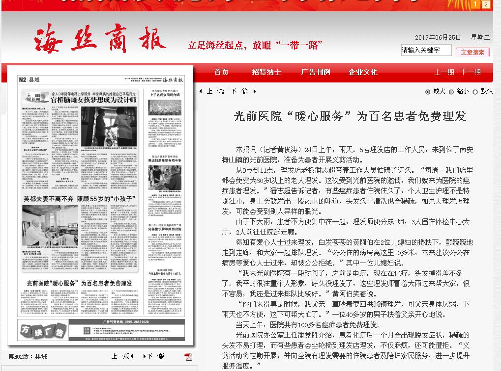 邀請(qǐng)專業(yè)理發(fā)師定期來(lái)院為住院患者及陪護(hù)家屬提供免費(fèi)理發(fā),是我院開(kāi)展落實(shí)“暖心服務(wù)”三年行動(dòng)的一項(xiàng)特色服務(wù)舉措。本次活動(dòng)既是暖心義剪的延續(xù),也是我院七一期間慶祝建黨98周年系列主題活動(dòng)之一,在黨員志愿者們的共同參與下,專業(yè)的理發(fā)師們利落的手法剪掉的不僅是患者長(zhǎng)長(zhǎng)長(zhǎng)亂的煩惱絲,而是“咔嚓”掉夏日的燥熱、病中的不便,為他們送去醫(yī)院及社會(huì)各界關(guān)愛(ài)的一抹清涼。此次義剪共為近百位患者提供免費(fèi)理發(fā)和剃胡須等服務(wù),備受患者及其家屬的一致好評(píng)?!芭姆?wù)就是解決患者最需要解決的事”,我院將繼續(xù)努力創(chuàng)造條件,將這份愛(ài)心延續(xù)、傳承,將暖心服務(wù)進(jìn)行到底。