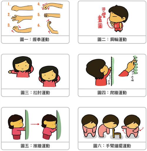 3. 屈肘:健側(cè)手托住患側(cè)肘部,患肢盡量伸直,伸直時(shí)手掌展開,屈肘時(shí)握拳。術(shù)后第2天開始。