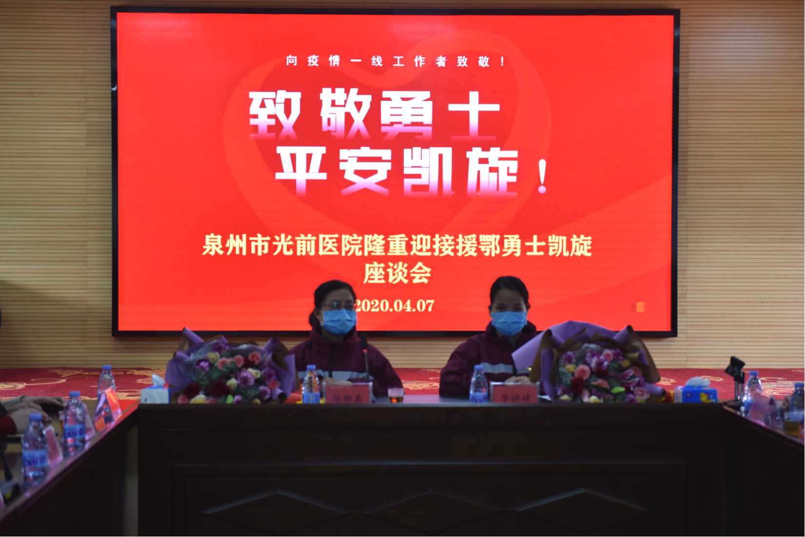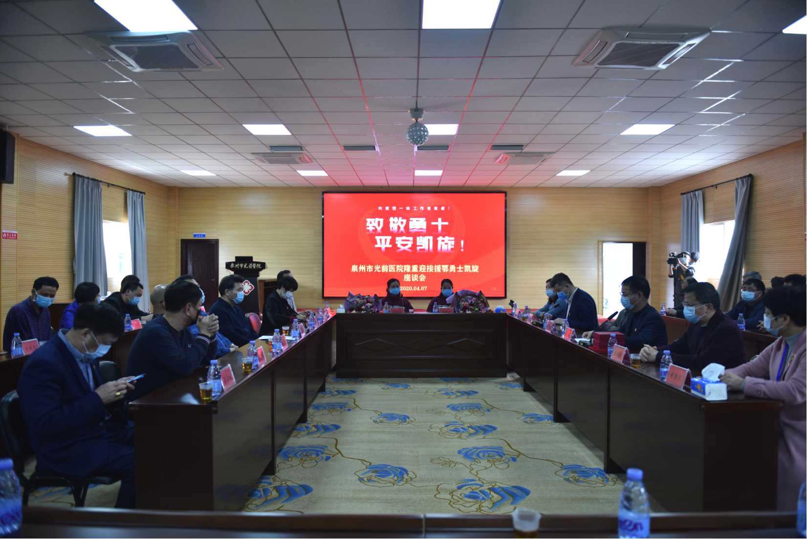 座談會上,梅山鎮(zhèn)黨委黃西岳書記、南安市衛(wèi)健局謝志平副局長、南安市芙蓉基金會李揚川理事長、梅山鎮(zhèn)僑聯(lián)李文新主席、梅山鎮(zhèn)商會侯文聰會長等領(lǐng)導(dǎo)和嘉賓先后發(fā)言,對義無反顧、馳援武漢的兩位勇士表示感謝,感謝她們不懼艱難、逆行而上的巨大付出與奉獻,也為她們平安凱旋表示熱烈祝賀,同時對我院防控工作給予充分的肯定與贊許。