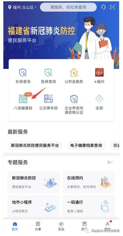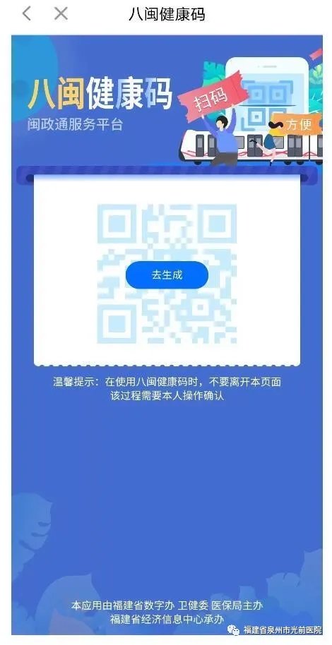 為鞏固疫情防控成果,方便廣大群眾就診,請來院人員按流程申領“八閩健康碼”,提前申領“八閩健康碼”,以便到院就診時及時出示。老人、兒童及其他無法自行申領的人員,可由同行人員代為申領并出示。