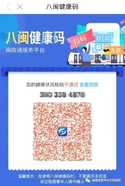 生成個人專屬的“八閩健康碼,綠色表示健康狀況核驗通過,橙色表示健康狀況核驗不通過,可點擊查看原因