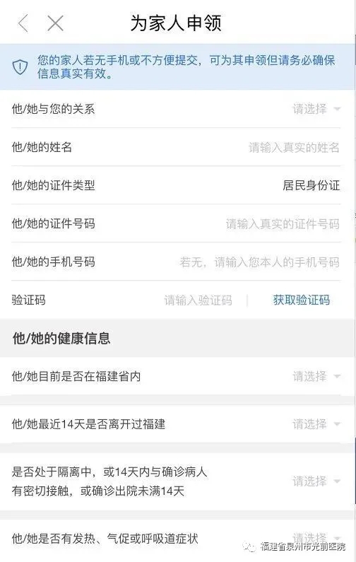 用戶實名登陸閩政通APP,進入“八閩健康碼”服務,選擇“為家人申領”,按要求填寫家人身份信息和健康信息,即可為配偶、55周歲以上(含55周歲)父母、16周歲以下子女申領“八閩健康碼”。