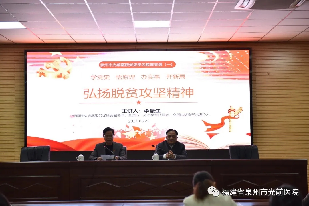 在院黨委書記兼副院長(zhǎng)黃向陽的主持下,黨課拉開序幕。李振生同志在全國扶貧攻堅(jiān)戰(zhàn)中,率先創(chuàng)新幫扶思路,在帶領(lǐng)不靠山、不靠海的蓉中村民脫貧致富奔小康后,總結(jié)出“換腦、育種、造血、夯基”四步走的幫扶經(jīng)驗(yàn),為破解全國貧困村普遍存在的“空心村”“空殼村”“三留守村”難題探索出一條好路子,開啟了村級(jí)參與扶貧攻堅(jiān)戰(zhàn)的先河。作為全國扶貧志愿服務(wù)促進(jìn)會(huì)副會(huì)長(zhǎng),李振生提出了“1+11”的扶貧新模式,幾年來在閩、甘、寧三省區(qū)48個(gè)貧困縣,共培訓(xùn)500個(gè)扶貧創(chuàng)業(yè)導(dǎo)師和近千個(gè)創(chuàng)業(yè)致富帶頭人,有力地推進(jìn)了貧困村的脫貧步伐。扶貧路上的“織夢(mèng)人”李振生先后榮獲全國脫貧攻堅(jiān)獎(jiǎng)創(chuàng)新獎(jiǎng)、全國五一勞動(dòng)獎(jiǎng)?wù)隆⑷珖鴥?yōu)秀黨務(wù)工作者、全國脫貧攻堅(jiān)先進(jìn)個(gè)人等榮譽(yù)稱號(hào)。作為榮獲全國創(chuàng)先爭(zhēng)優(yōu)先進(jìn)基層黨組織、全國文明村、全國民主法治示范村、全國扶貧先進(jìn)單位的社會(huì)主義新農(nóng)村蓉中村的領(lǐng)頭人,李振生在脫貧與黨務(wù)工作方面頗有心得,講起課來,語言幽默風(fēng)趣、事例信手拈來,化繁為簡(jiǎn),深入淺出,令在場(chǎng)的黨員受益多多。他認(rèn)為開展黨務(wù)與脫貧攻堅(jiān)工作思路其實(shí)是一致的,基礎(chǔ)都在于“靈魂塑造”。結(jié)合黨史學(xué)習(xí)教育,他著重從為什么學(xué)、怎樣學(xué)、怎樣做三方面來闡述。他指出,作為醫(yī)務(wù)工作者應(yīng)該通過學(xué)黨史悟思想,進(jìn)一步塑造為人民健康服務(wù)的“靈魂”;在日常診療服務(wù)中,要時(shí)時(shí)處處為患者辦實(shí)事,與家屬溝通時(shí)要注意技巧;在日常生活中,要充分發(fā)揮黨員的先鋒模范作用,強(qiáng)化道德修養(yǎng),從小事做起,敢于制止不當(dāng)言論,抓牢意識(shí)形態(tài)工作,傳播弘揚(yáng)正能量。