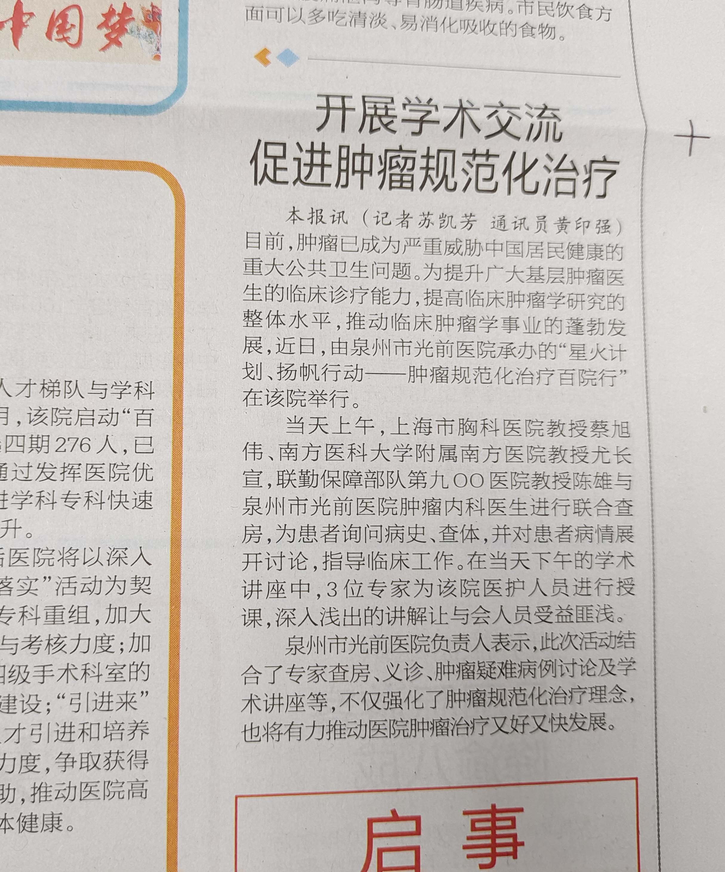 開展學(xué)術(shù)交流 促進腫瘤規(guī)范化治療(《泉州晚報》、泉州醫(yī)界)