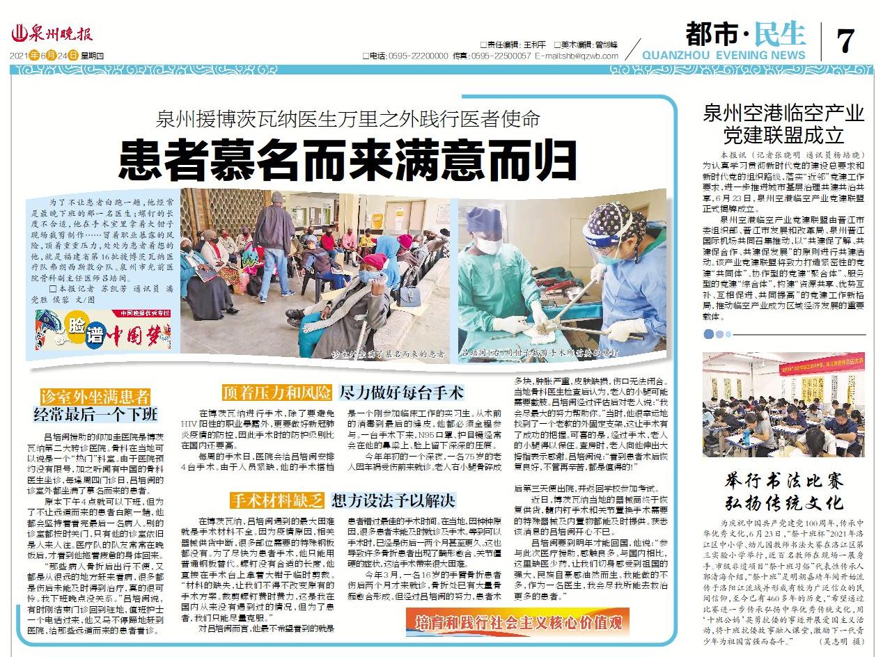 為了不讓患者白跑一趟,他經(jīng)常是最晚下班的那一名醫(yī)生;螺釘?shù)拈L度不合適,他在手術(shù)室里拿著大鉗子現(xiàn)場裁剪制作……冒著職業(yè)暴露的風(fēng)險,頂著重重壓力,處處為患者著想的他,就是福建省第16批援博茨瓦納醫(yī)療隊弗朗西斯敦分隊、泉州市光前醫(yī)院骨科副主任醫(yī)師呂培閩。