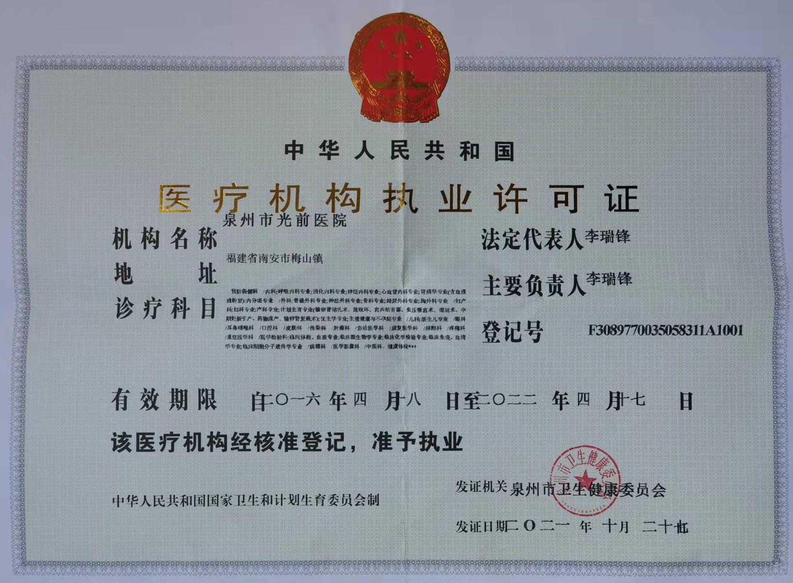 泉州市光前醫(yī)院醫(yī)療機(jī)構(gòu)執(zhí)業(yè)許證變更