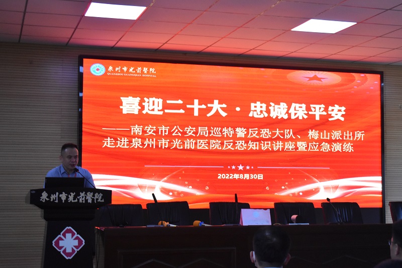 為進(jìn)一步提高應(yīng)對(duì)處置暴恐、突發(fā)事件的能力和水平,8月30日上午,我院聯(lián)合南安市公安局巡特警反恐大隊(duì)、梅山派出所,開(kāi)展了以“喜迎二十大 忠誠(chéng)保平安”為主題的反恐知識(shí)講座暨應(yīng)急演練活動(dòng),全院中層干部、科室安全員、保安等近百人參加活動(dòng)。
