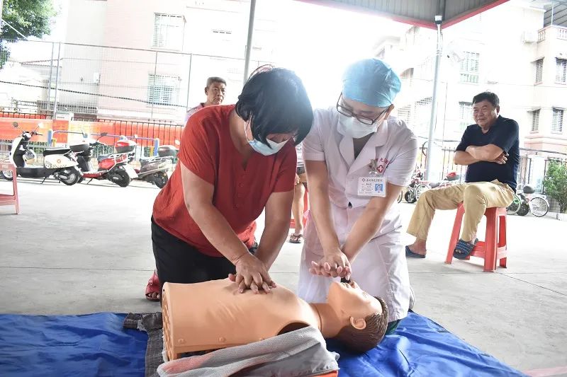 為做好急救知識(shí)宣傳普及工作,提高周邊群眾尤其老年人突發(fā)事故應(yīng)急救護(hù)能力,急診科林永強(qiáng)主治醫(yī)師為現(xiàn)場(chǎng)群眾開(kāi)展心肺復(fù)蘇、海姆立克等急救知識(shí)培訓(xùn)。培訓(xùn)分理論知識(shí)講解和實(shí)操訓(xùn)練兩個(gè)環(huán)節(jié)。理論講解環(huán)節(jié),林醫(yī)師用通俗易懂、幽默風(fēng)趣的語(yǔ)言,結(jié)合日常工作和生活中真實(shí)案例,為群眾講解心肺復(fù)蘇、海姆立克急救法及電除顫儀使用的一系列科普知識(shí)。實(shí)操環(huán)節(jié),在急診科副護(hù)士長(zhǎng)戴金寬主管護(hù)師的示范下,林醫(yī)師詳細(xì)講解胸外心臟按壓和海姆立克急救法中需要注意的關(guān)鍵要素,與現(xiàn)場(chǎng)群眾積極互動(dòng)、實(shí)操演練,手把手幫助他們快速掌握心肺復(fù)蘇、海姆立克急救要領(lǐng)。