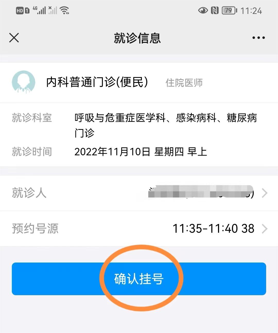 ⑥選擇就診人及預(yù)約號(hào)源,確認(rèn)掛號(hào)