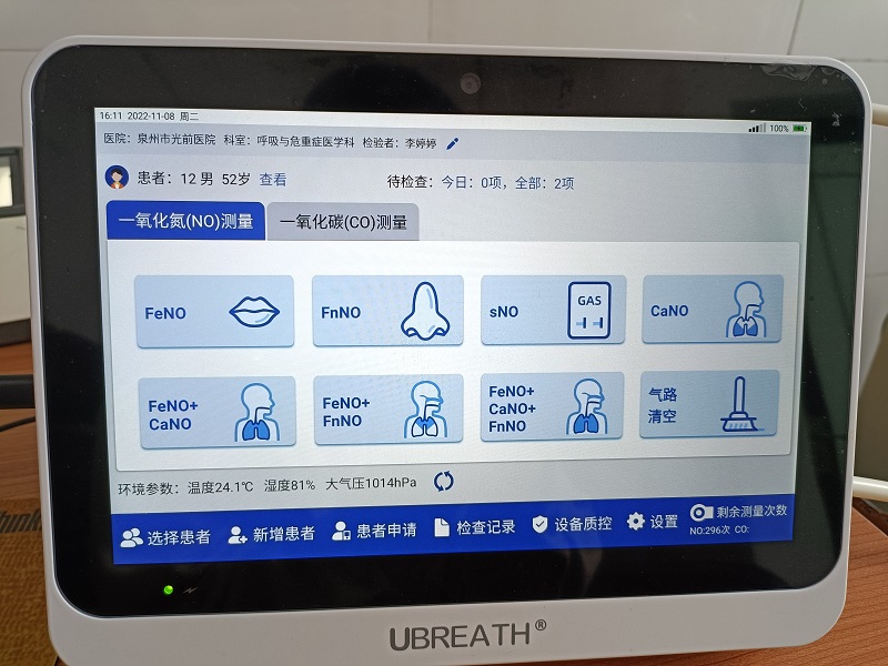 我院采用的是優(yōu)呼吸BA200型呼氣分析儀。優(yōu)呼吸BA200型呼氣分析儀是一款可快速測定呼出氣一氧化氮 (FeNO) 和呼出氣一氧化碳(FeCO)的醫(yī)療檢測設(shè)備。該設(shè)備能夠快速獲得精確、定量的氣道炎癥測量值,藉此更加有效地對哮喘及其他呼吸慢病的炎癥進行鑒別診斷和管理,以及戒煙門診的治療監(jiān)控。