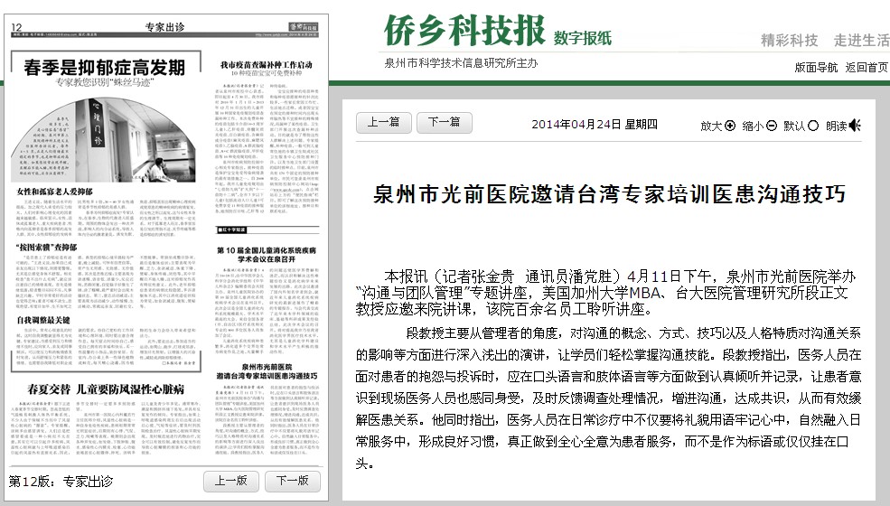 泉州市光前醫(yī)院邀請臺灣專家培訓醫(yī)患溝通技巧(《僑鄉(xiāng)科技報》)