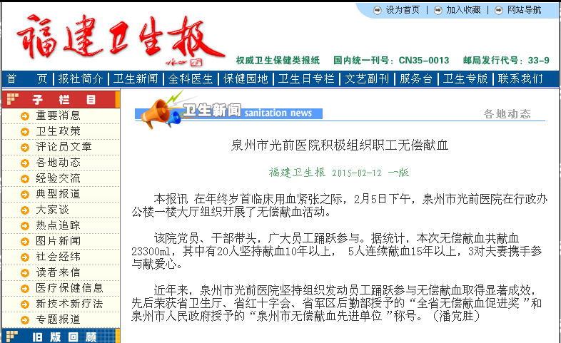 我院開展2015年度無償獻血工作(《福建衛(wèi)生報》、《僑鄉(xiāng)科技報》)