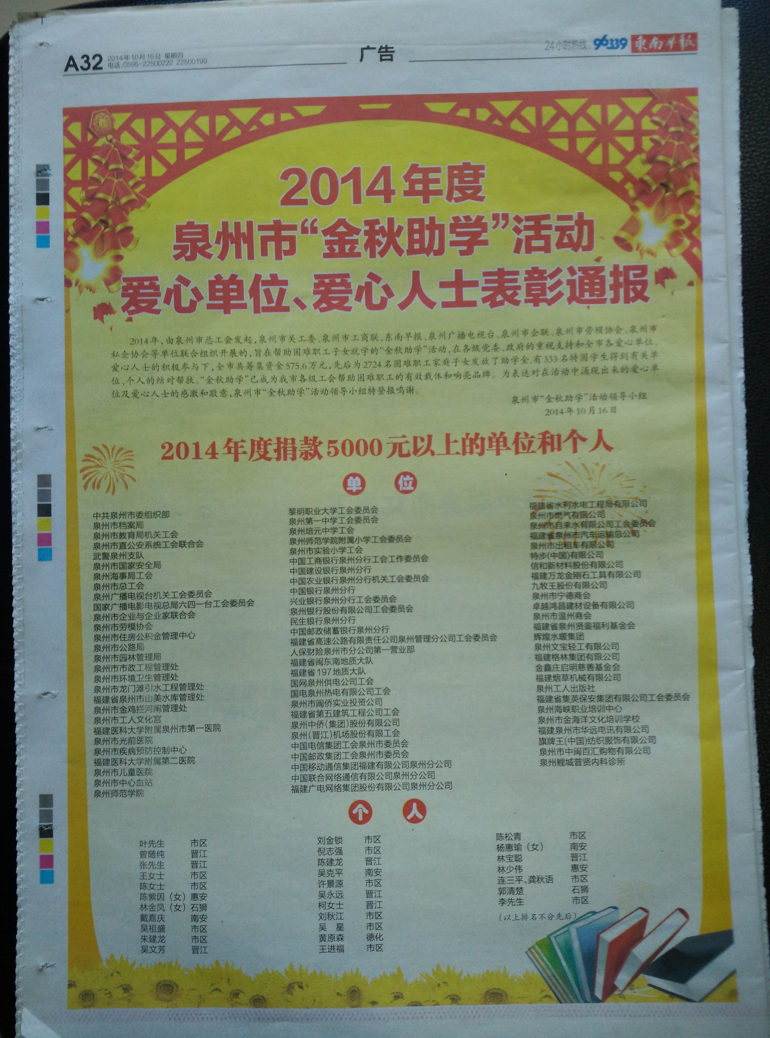 今年,我院繼續(xù)參加泉州市總工會(huì)發(fā)起的“金秋助學(xué)”活動(dòng),為了幫貧困學(xué)生圓讀書夢(mèng),在籌集助學(xué)資金向泉州市金秋助學(xué)帳戶捐資的同時(shí),推薦申請(qǐng)了一位肝移植手術(shù)、家庭經(jīng)濟(jì)困難職工的子女作為助學(xué)對(duì)象,并得到“金秋助學(xué)”活動(dòng)的資助。