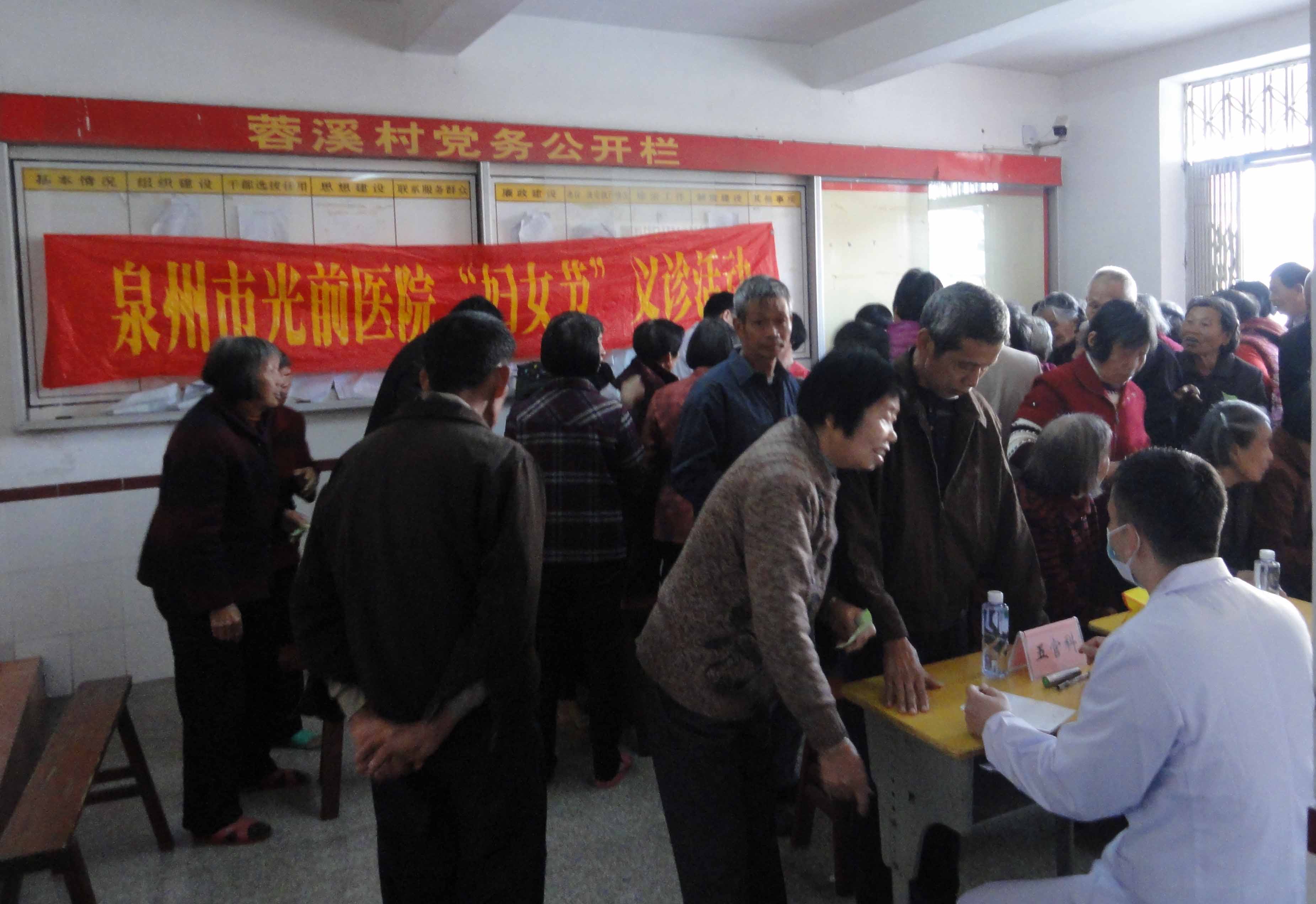 2016年3月5日上午,結合開展“學雷鋒‘鄰里守望·情暖八閩’主題志愿服務活動”和紀念國際婦女節(jié)等,我院選派內(nèi)、外、婦、兒、五官、皮膚、腫瘤科等臨床專家組成志愿服務隊,前往蓉溪村開展送醫(yī)送藥下鄉(xiāng)義診活動,為廣大農(nóng)村婦女及周邊群眾送去健康與關愛?;顒蝇F(xiàn)場,專家們熱情地為群眾問診、測量血糖血壓、贈送藥品,耐心解答健康咨詢,開展醫(yī)學科普宣教。