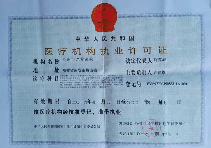 泉州市光前醫(yī)院醫(yī)療機構執(zhí)業(yè)許證及其